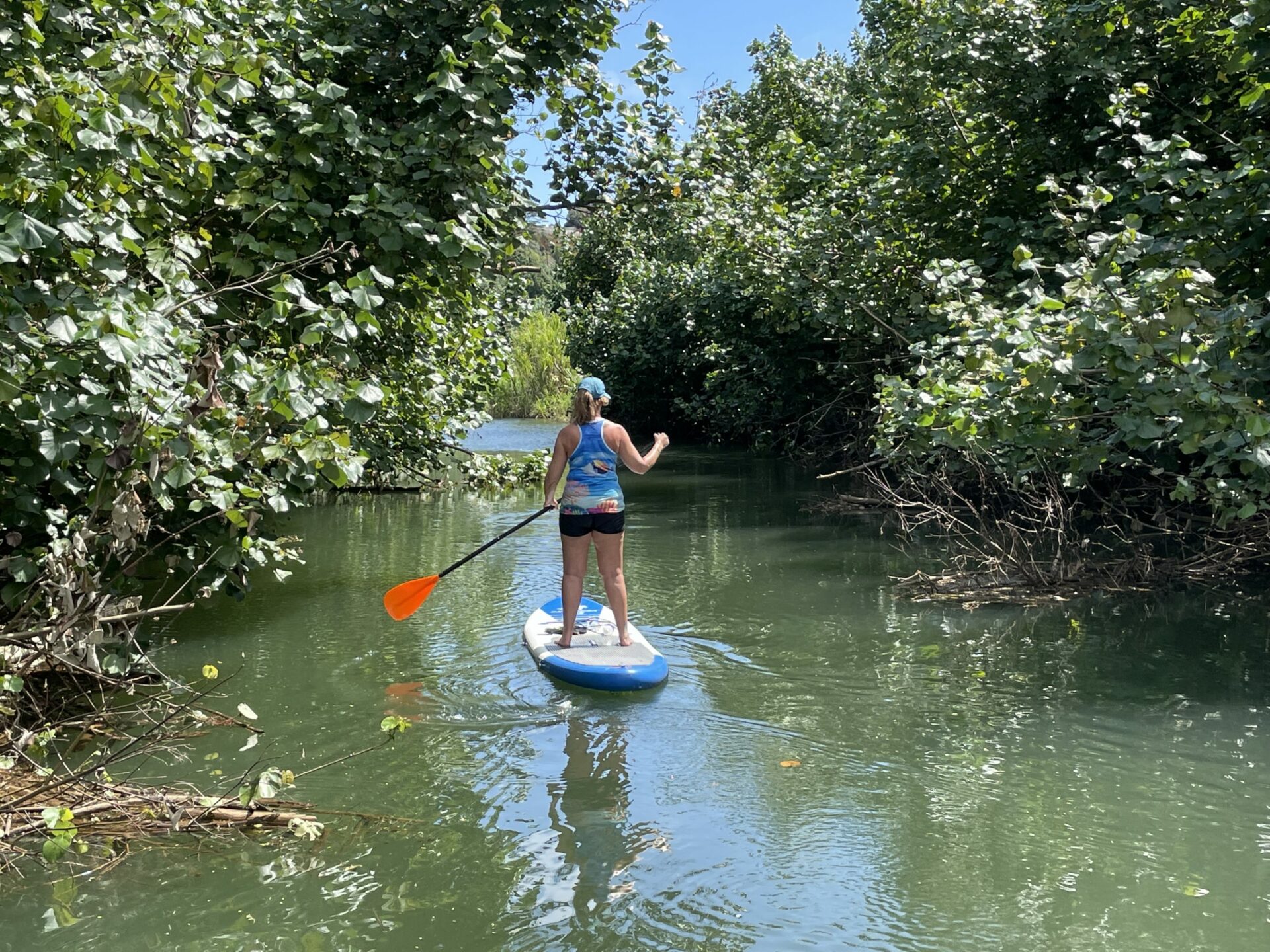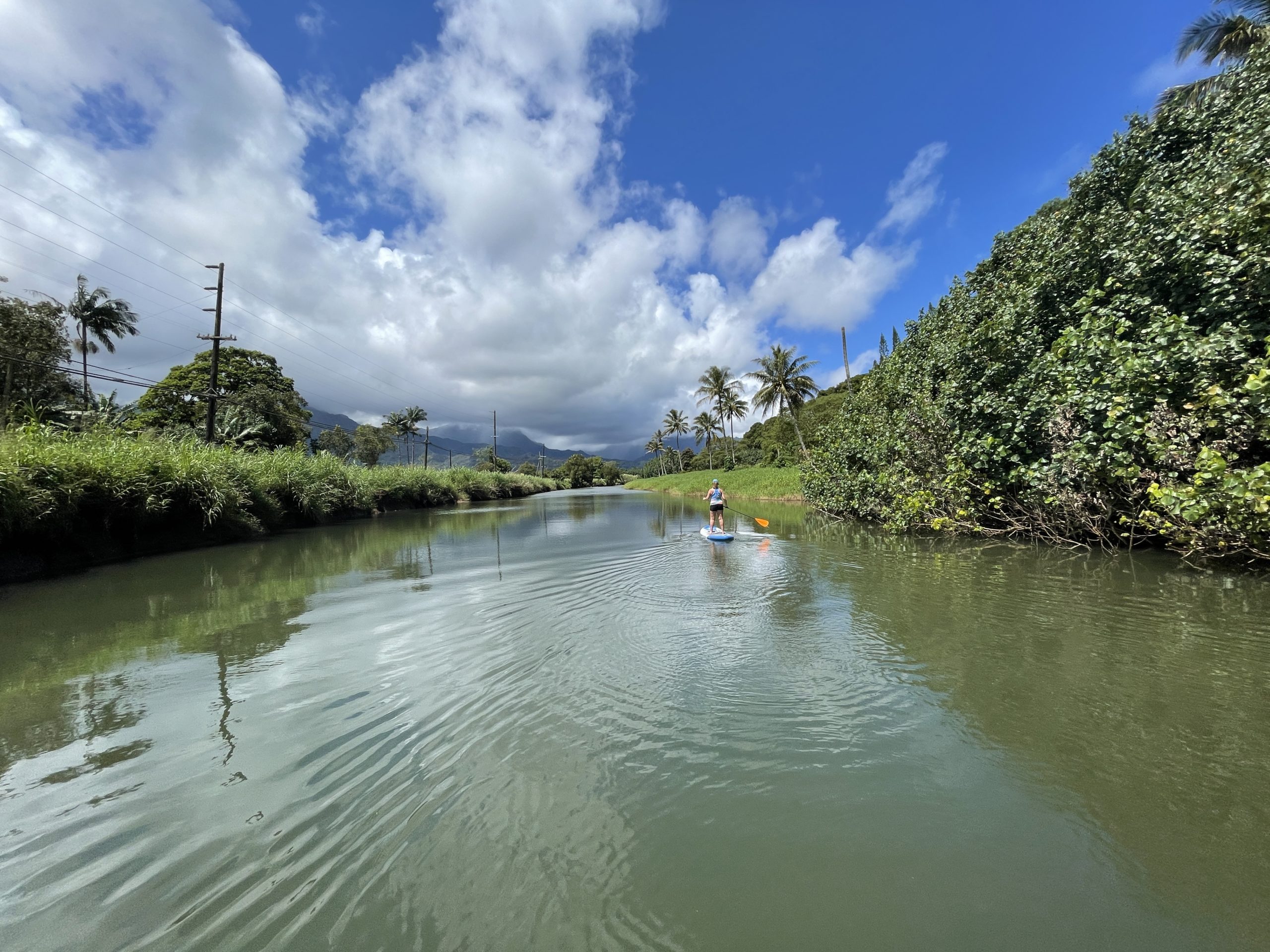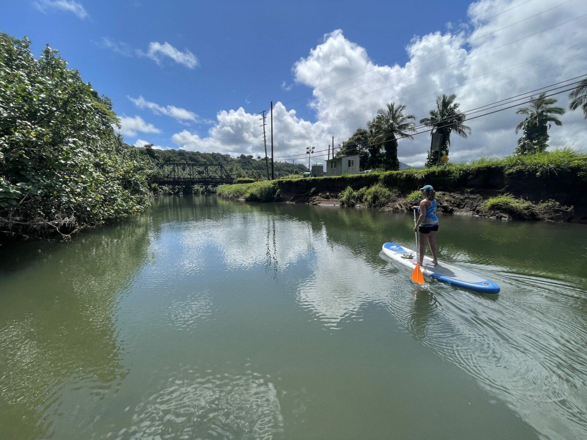 Upstream is good if you like jungle vegetation and a more close-in experience. You can go further upstream as well. You will get expert instruction at Kayak Hanalei (the first time we had never been paddle boarding). They are very patient and you start out standing up.