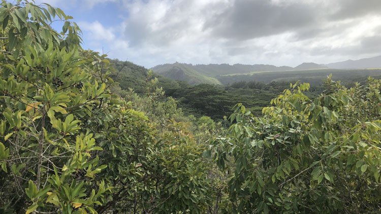 Okay, it’s really the plant canopy – huge bushes grow over the trail most of the way. It’s shady, a plus on a hot day, but not as picturesque as the more famous Nounou Trail.